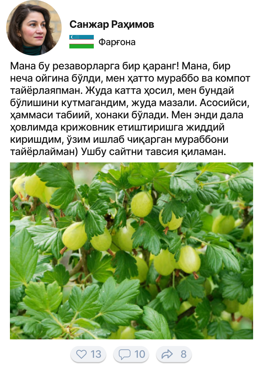 Крижовник кўчатларини фақат суғориш керак, улар мамлакатнинг барча вилоятларида ўсади.