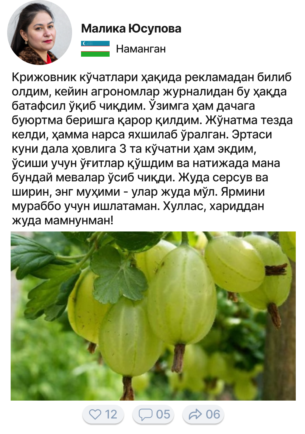 Кўчатлар тўпламини супер чегирма билан буюртма қилишга шошилинг ва ҳозироқ крижовник етиштиришни бошланг!